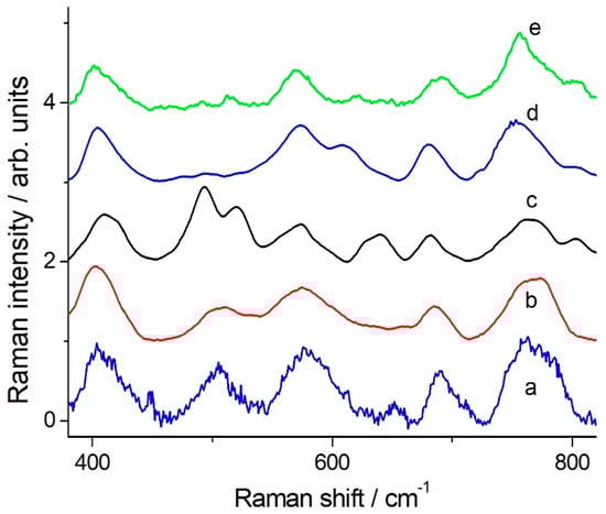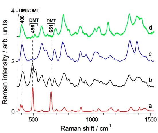 The SERS spectrum of a freshly made solution (Figure 2b) still exhibits the strong band at 496 cm−1 that dominates the solid DMT Raman spectrum. This band almost disappears 15 min after sample preparation and the spectrum (Figure 2c) becomes practically coincident with the OMT SERS spectrum. Therefore, these new results strongly support the hypothesis of a rapid DMT decomposition to OMT, promoted by AgNPs, in water solution.