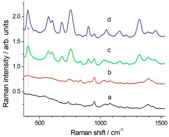 SERS spectra (785 nm excitation, BWTek portable Raman spectrometer) for different nominal DMT concentration: 0.0 (only AgNPs in water) (a), 1 × 10−6 (b), 5 × 10−6 (c), 1 × 10−5 M (d). Spectra are vertically shifted to improve data readability. The arrow points to the 406 cm−1 band used for DMT quantification.