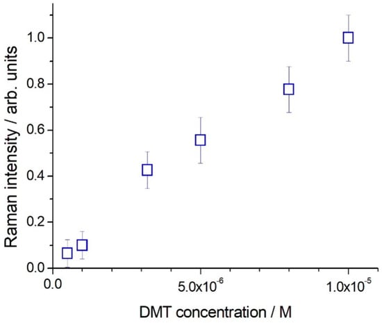 Application of SERS for quantitative analysis is quite difficult [31,32]. Also, the clear definition of the limit of detection (LOD) for an analyte in Raman/SERS spectroscopy is not straightforward. The signal-to-noise ratio depends on optical layout, characteristics of the detector, available laser power, integration time and number of averaged spectra and quality of the SERS active substrate, among the other parameters. However, for a practical application of the SERS method we must try to provide some indication: Figure 3 shows typical spectra, which were obtained with an integration time of 100 s, 5 averages, laser wavelength 785 nm, 20 mW at the sample using the portable system. The most suitable band for a quantitative data evaluation is that at 406 cm−1, a single peak standing out of a flat background. The peak appears to be common to DMT and OMT [11]. By the use of that reporting signal, the DMT detection limit is determined as low as 5 × 10−7 M, corresponding to a signal to noise ratio equal to 3 in the peak height determination. A good linearity for the SERS signal at 406 cm−1 as a function of the DMT concentration was obtained in the range 5 × 10−7–1 × 10−5 M (see Figure 4).