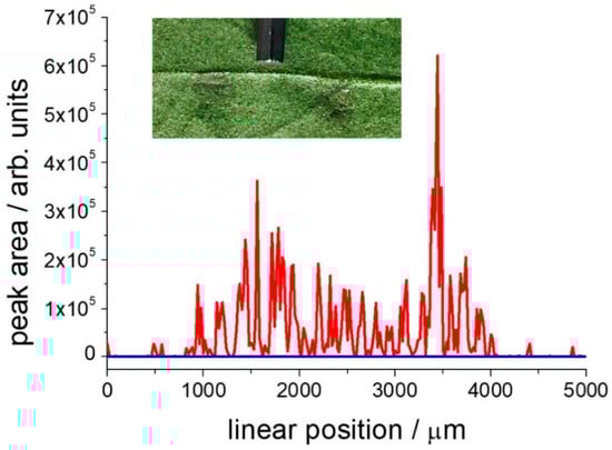 Plot of the 406 cm−1 peak area in a 5 mm line-scan (20 μm step) passing across a 3 mm diameter area treated with the AgNPs solution, either DMT treated or not. The flat, blue line refers to the DMT-free leaf surface; the red line refers to the DMT-treated leaf surface. The inset show a picture of the leaf and the two measured areas (DMT treated and not), possibly identified as grey circles due to the presence of AgNPs. We placed the tip of a 2 mm hex key in between the two spots to set the scale of the image. Data obtained with the Renishaw RM2000 Raman microscope.