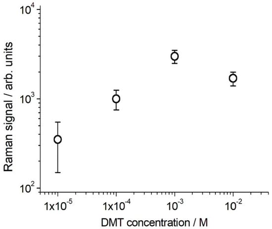 SERS signal (785 nm excitation, BWTek portable Raman spectrometer) of the band at 406 cm−1 as a function of DMT nominal concentration, measured on three sets of samples. The standard deviation for each data point is reported.