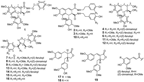 The known compounds were identified as 1,2-dihydro-6,8-dimethoxy-7-hydroxy-1-(3,5-dimethoxy- 4-hydroxyphenyl)-N1,N2-bis-[2-(4-hydroxypeenyl)ethyl]-2,3-naphthalene dicarboxamide (10) [20], (+)-9,9′-O-di-(E)-feruloyl-5,5′-dimethoxy secoisolariciresinol (11) [25], (+)-9,9′-O-di-(E)-feruloyl-secoisolariciresinol (12) [12], (+)-9′-O-(E)-feruloyl-5,5′-dimethoxylariciresinol (13) [24], (+)-9′-O-(E)-feruloyl-5′-methoxylariciresinol (14) [26], (+)-5,5′-dimethoxylariciresinol (15) [27], (+)-5′-methoxylariciresinol (16) [28], arctigenin (17), matairesinol (18) [29], and (7E,8R′)-didehydroarctigenin (19) [30], respectively, by spectroscopic analysis and comparison of the data obtained with literature values.