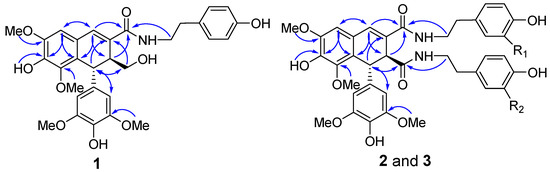 Compound 3 gave the same molecular formula, C39H42N2O11, as that of 2 by analysis of the HRESIMS. Compound 3 shared almost identical UV, IR, and 1H- and 13C-NMR features to those of 2, which suggested that they both contained the 4,4′-dihydroxy-3,5,3′,5′-tetramethoxy-2,7′-cyclolignan- 7-en-9,9′-diamide core, a tyramine, and a 3-methoxytyramine moieties.