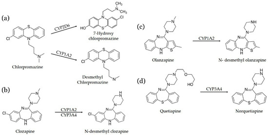 Biotransformation pathways of (a) Chlorpromazine, (b) Clozapine, (c) Olanzapine, and (d) Quetiapine. CYP = cytochrome P450 complex. CYP1A2, CYP2D6, and CYP3A4 are isoenzymes of cytochrome P450 complex.