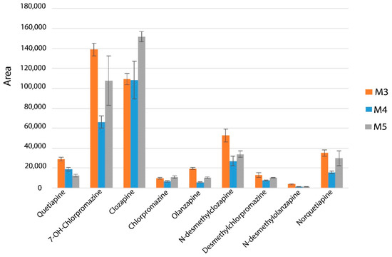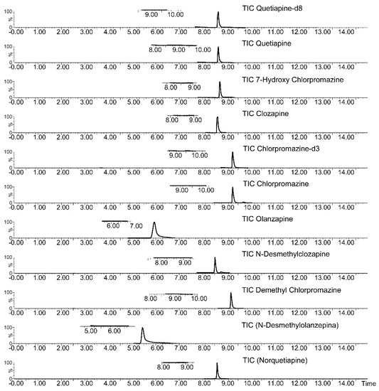 The proposed method was successfully applied to determine the target antipsychotics in plasma samples from three schizophrenic patients undergoing therapy with atypical antipsychotics (Table 6). Consequently, this method could be used for therapeutic drug monitoring.