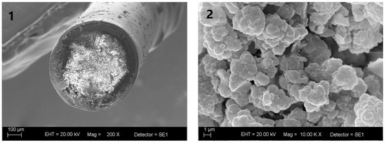 Scanning electron microscope images of the cross-section of poly(butyl methacrylate-co-ethyleneglicol dimethacrylate) monolith capillary at (1) 200× magnification and (2) 10,000× magnification.