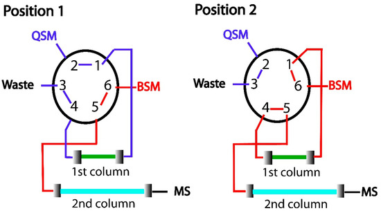 Two columns were connected by means of a six-port valve, as shown in Figure 6. The monolithic column (first dimension) was connected to the quaternary pump (QSM), and the analytical column (second dimension) was connected to the binary pump (BSM). In the first step, the six-port valve was set in position 1, which allowed the columns to be conditioned with the initial mobile phase composition (Table 7). Then, 10 µL of the sample solution was injected into the system. Water was used as mobile phase to percolate the sample solution through the monolithic capillary at a flow rate of 100 µL min−1. In this step, analytes were pre-concentrated, and macromolecules from plasma samples were eluted for waste. After 2.0 min, the six-port valve was set to position 2. The target drugs from the monolithic capillary were eluted to the analytical column using the mobile phase (BSM pump), consisted of (A) 10 mmol L−1 ammonium acetate (with 0.1% formic acid) and (B) acetonitrile (80:20 v/v), at a flow rate of 100 µL min−1. At 6.50 min, the six-port valve was set to position 1. Using the same mobile phase, from 6.51 to 13.00 min, the chromatographic separation occurred at 300 µL min−1. From 7.0 to 16.5 min, acetonitrile was percolated through the monolithic capillary for clean-up. After this time, both columns were conditioned with the initial mobile phase composition for the following sample injection (Table 7). Different mobile phases were evaluated to establish the highest analyte sorption and the best analyte resolution within the minimum analysis time.
