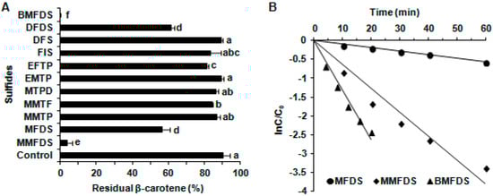 As presented in Figure 1B, β-carotene degradation upon exposure to MMFDS, BMFDS and MFDS followed first-order kinetics, consistent with the kinetic model in dichloromethane system []. The corresponding kinetic parameters are listed in Table 2. It can be seen that the presence of BMFDS in ethanol significantly improved the k and shortened the t1/2 of β-carotene degradation, compared with the other two sulfides. The k and t1/2 were 0.131 min−1 and 5.29 min for BMFDS, while they were 0.0633 min−1 and 10.95 min for MMFDS and 0.0095 min−1 and 72.96 min for MFDS, respectively. Furthermore, it should also be noticed that these three kinds of sulfides (MMFDS, BMFDS and MFDS) having obviously promoting effects on the degradation of β-carotene contain at least two sulfur atoms, which is consistent with the previous report []. These results suggest that sulfides with more sulfur atoms might trigger a stronger chemical effect on β-carotene stability in ethanol model system.