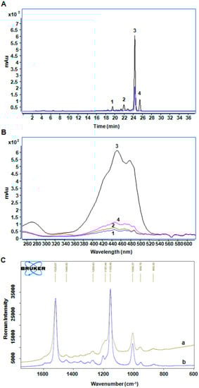 According to the remarkable acceleration effect of BMFDS, HPLC-DAD-APCI-MS combined with Raman spectroscopy was applied to make a preliminary identification about the oxidation products of β-carotene, given their low contents and rather complex process of products collection. The chromatographic and spectral data of the oxidation products of β-carotene by HPLC-DAD-ACPI-MS are shown in Figure 2 and Table 4. The chromatographic peaks of leading β-carotene oxidation products had the same peak time in both the experimental group and the control group. Therefore, it was supposed that β-carotene treated with or without BMFDS under UVA irradiation had the same oxidation products (Figure 2A). In comparison to the retention time of a standard product (24.322 min) (Table 4), peak 3 was confirmed as all-trans-β-carotene (24.319 min) (Figure 3A). The UV spectra data are depicted in Figure 2B, and among the four obvious peaks, peak 2 and peak 4 were identified tentatively as 13-cis-β-carotene [] and 9,13-di-cis-β-carotene [], respectively (Figure 3C,D) according to the spectral characteristics and Q-ratios (Table 4), which were stipulated as the absorbance ratio of the middle main absorption peak to the cis peak.