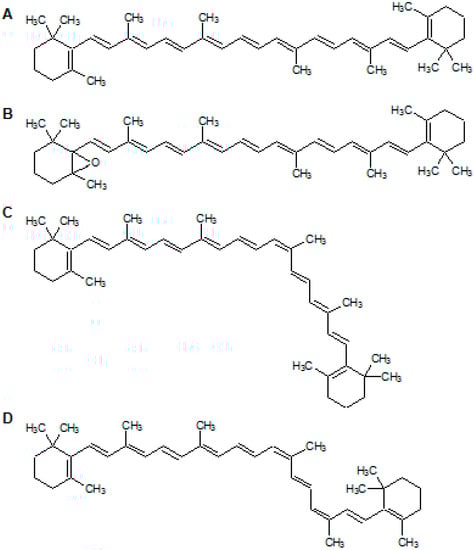 - Gul, K.; Tak, A.; Singh, A.K.; Singh, P.; Yousuf, B.; Wani, A.A. Chemistry, encapsulation, and health benefits of β-carotene—A review. Cogent. Food Agric. 2015, 1, 1018696. [Google Scholar] [CrossRef]