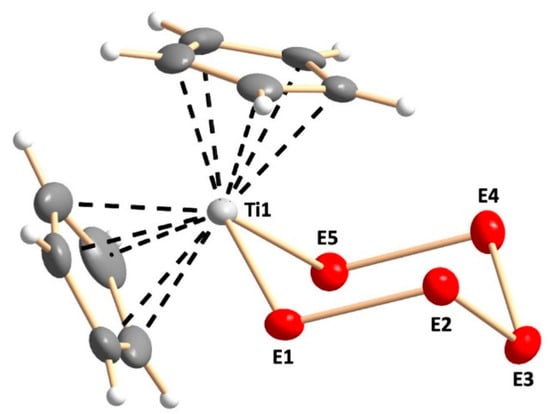 The crystal structures of [TiCp2S5] (Phase A) [9,10,11], [TiCp2Se5] (Phase F) [13,14], and Phase D [15] are well-known. The crystal structures of Phases B, C, and E have been determined in this work. All phases A–F show similar structures of the bidentate anionic chelating E52− ligand (E = S, Se) coordinating to a titanium atom of the bis(cyclopentadienyl)titanium fragment, as shown in Figure 2.