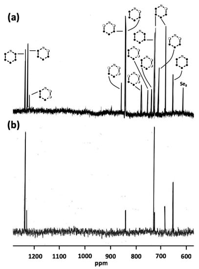 (a) The 77Se-NMR spectrum of phase D recorded previously in CS2 together with the tentative assignment [15] (adapted with permission from Pekonen, P.; Hiltunen, Y.; Laitinen, R.S.; Valkonen, J. Selenium-77 NMR Spectroscopic and X-ray Crystallographic Characterization of Bis(cyclopentadienyl)titanium Selenide Sulfide Mixtures [Ti(C5H5)2SexS5-x]. Inorg. Chem. 1991, 30, 1874–1878. Copyright 1991 American Chemical Society). (b) The 77Se-NMR spectrum of phase E recorded in CS2.