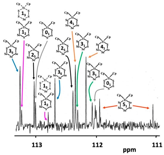 Since it has been deduced earlier from the crystallographic disorder scheme that the Phase D must also contain [TiCp2S5] (01) [15], which cannot be detected by 77Se NMR spectroscopy, the 13C NMR spectra of all phases A–F were recorded in this contribution. All complexes present in the mixtures show 13C NMR resonances due to the carbon atoms in the cyclic η5-C5H5 ligand. 1H NMR spectroscopy has shown that in solution at room temperature, the ligand is rotationally fluxional [23,24]. Since it is also known that conformational chair-chair inversion of the hexaatomic TiE5 chelate ring does not take place under ambient conditions [23,24], two resonances are observed in 1H and 13C NMR spectra for each [TiCp2SexS5−x] complex (for a typical 13C NMR spectrum, see Figure 4).