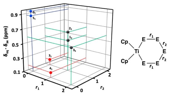 The twenty complexes can have their five chalcogen atom positions occupied either by sulfur or selenium resulting in a varying number of homo- and heteronuclear chalcogen-chalcogen bonds. [TiCp2S5] (01) and [TiCp2Se5] (51) contain no heteronuclear S–Se bonds and both show a large difference of 0.94 and 0.88 ppm between the chemical shifts of the fluxional equatorial and axial C5H5− ligands. [TiCp2Se4S] (41) and [TiCp2Se3S2] (31) both contain one heteronuclear S–Se bond either in the position marked by r1 or r2 (see Figure 5) and show a very small chemical difference of 0.17–0.18 ppm. Other [TiCp2SexS5−x] complexes show a total of two Se–S bonds either in the position r1 or r2. They show chemical differences in the range 0.47–0.65 ppm.