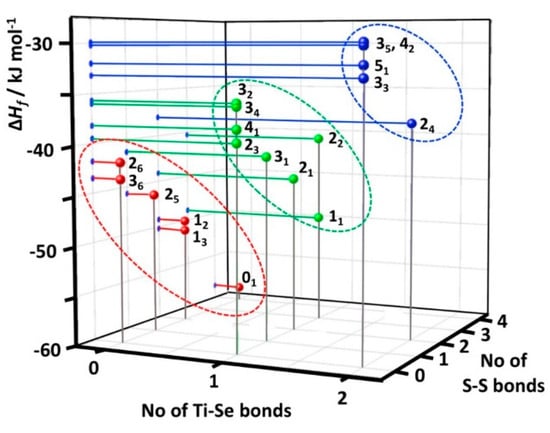 Enthalpies of formation of the [TiCp2SexS5−x] complexes as a function of the number of Ti–Se and S–S bonds. Complexes with two Ti–Se bonds have been marked in blue, those with one Ti–S and one Ti–Se bond in green, and those with two Ti–Se bonds in red.