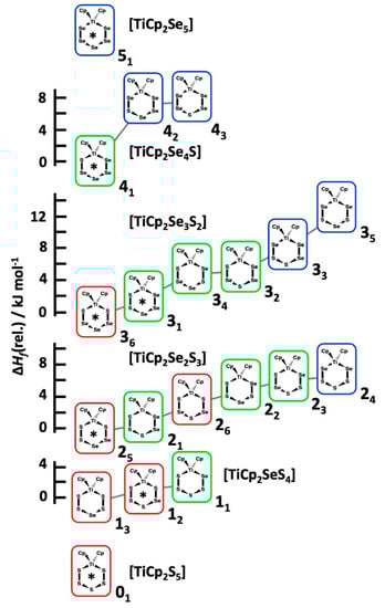 The relative enthalpy of formation of the [TiCp2SexS5−x] isomers of the same composition. The most stable isomer is given the relative value of 0 for each composition. The red frames indicate two Ti–S bonds, green frames one Ti–S and one Ti–Se bond, and the blue frames two Ti–Se bonds. The complexes observed in the reaction mixtures by 77Se and 13C NMR spectroscopy have been indicated by an asterisk.