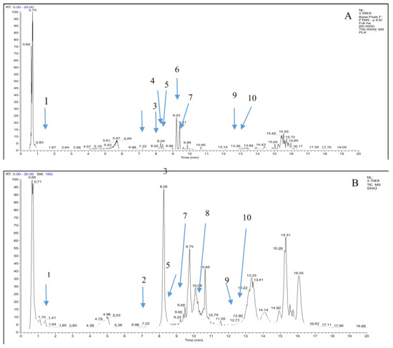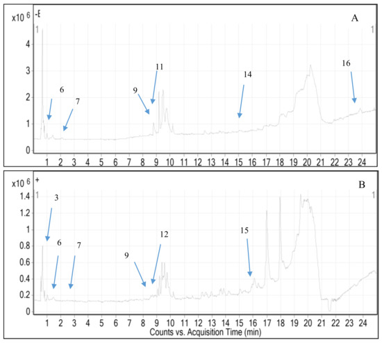 Total ion chromatogram from ethanol extract of M. odorata peel (A) negative mode and (B) positive mode.