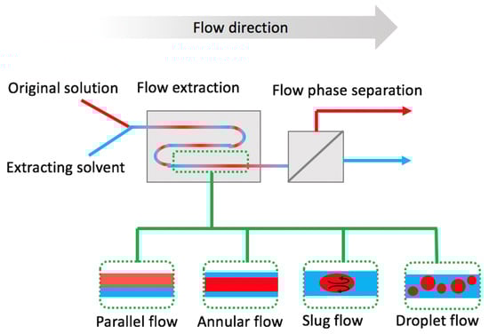 Liquid-liquid microflows can lead to different types of flow regimes depending on specific flow conditions as shown in Figure 1. Parallel, annular, slug, and droplet flows [14,15] can be observed as flow rates, liquid properties and phase ratios are altered. Inertial, viscous, and interfacial forces are the three main parameters that define the flow regime in different setups. For instance, if viscous and inertial forces dominate over the interfacial force, then parallel flow is observed [16]. Flow maps have been reported by several authors [17,18] to predict the extraction regime solely based on flow parameters and solvent features. Modifications to the fluidic network, such as wall coatings that improve wetting, provide a further control on the extraction regime [19]. Alternatively, pillar or porous structures can be implemented to stabilize the interface [20,21,22]; as an example of this approach, Chang et al. have reported use of helix wires to stabilize a coaxial flow [23]. In this application, the operating window (1–3000 µL/min was reported) depends on the pitch of the wires, whereas higher flow rates can be achieved using smaller pitch.