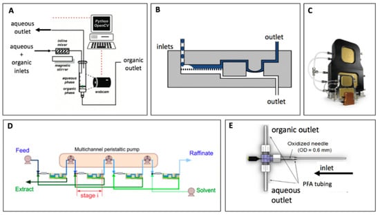 (A) a computer-vision gravity-based phase separation, (B) Membrane-based separator with self-tuning element for monitoring pressure difference, (C) Zaiput’s liquid-liquid separator for continuous separation, (D) Arrangement of membrane-based separators for multistage extraction, (E) a simple phase separator using hydrophobic junction and hydrophilic needle (Adapted from [27,53,57]).