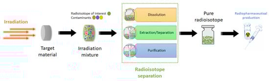 Medical isotopes are commonly produced with nuclear reactors or accelerators using processes of fission, neutron capture or bombardment of accelerated particles on a suitable target material. These nuclear reactions can be optimized to achieve selective mass transmutations, resulting in material mixtures containing the desired generated radioisotope. The entirety of chemical steps applied to such produced radioactive mixture to yield a high-purity radioactive species, is referred to as radiochemical separation. This separation represents a fundamental step in the medical production of radioisotopes, as it enables the isolation of the desired radioactive species from different elements, fission products, targets and by-products, in a form suitable for its intended application, as depicted in Figure 3. In this field, a working compromise is always sought among the standard chemical separation methods; however, they are not easily applicable since the conditions are mostly of non-equilibrium, and safe procedures for the treatment of radioactive materials impose certain safety boundaries on separation methods [60]. Indeed, the reactor- or accelerator-produced radionuclide processing has to take place in a shielded and controlled environment, such as a radiochemistry hood or hot cell inside laboratories that are authorized to perform the detention and handling of radioactive tracers and waste [61]. Moreover, if the product of interest is intended for human use, Pharmacopoeia and similar regulatory bodies impose specific product quality requirements for injection, such as sterility, apirogenicity, specific activity, as well as chemical, radiochemical and radionuclidic purity. In addition, final users, as local pharmaceutical manufacturers, will have to comply with additional regulations on the successive radiolabelling process (e.g., in “cold-kit” labelling procedures). Stringent requirements are also typically imposed on the overall procedure time, as this parameter will have to conveniently align with the half-life of the product radionuclide.