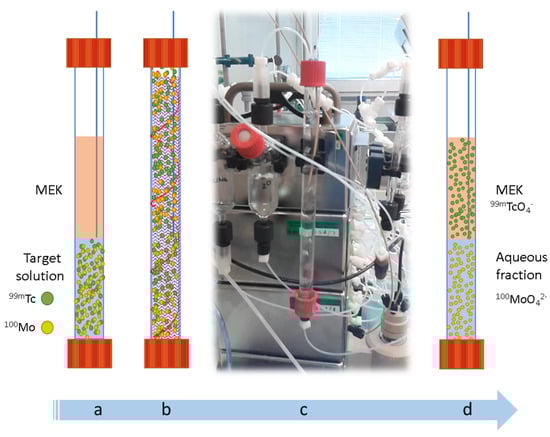Schematic description of the steps of the automated on-column solvent extraction with MEK of 99mTc from a 100Mo irradiated target solution. (a) addition of the extractant MEK to the aqueous target solution containing molybdate, pertechnetate anions and contaminants; (b) mixing of the two immiscible phases through helium bubbling and extraction of the pertechnetate by the solvent MEK from the aqueous phase; (c) photograph of the bubbling step in the automatic module developed by Martini et al; (d) phases separation.
