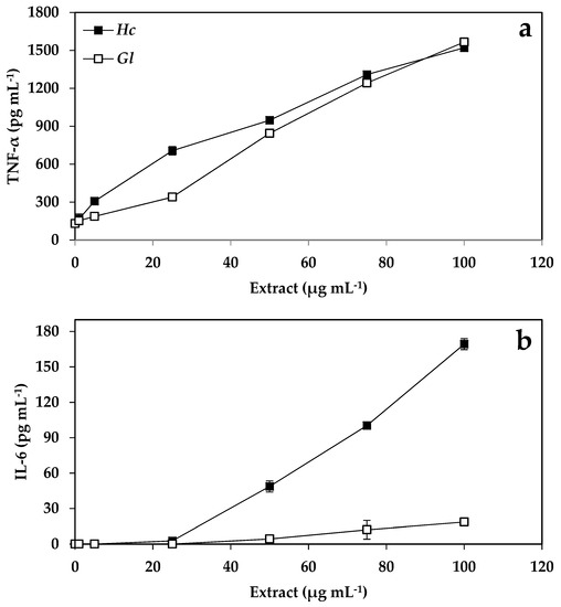 Regarding the immunological properties of the compounds obtained from algae, the studies that have been carried out aimed to induce macrophage secretions of cytokines (interleukin IL-6) and activation of tumor necrosis factors (TNF-α), as well as mediators of inflammation such as nitric oxide (NO), among others [8]. The main role of TNF-α is the regulation of immune cells, and in addition it can act to reduce viral replication [12]. This cytokine is involved in systemic inflammation and stimulates the acute phase reaction. On the other hand, IL-6 is a multifunctional cytokine that can be proinflammatory or anti-inflammatory depending on the cell lines regulating several immune responses, including acute phase reactions, and it participates as a mediator of the inflammatory response [13]. Its production is induced by several factors, including TNF-α, IL-1β, and bacterial endotoxin lipopolysaccharides [14].