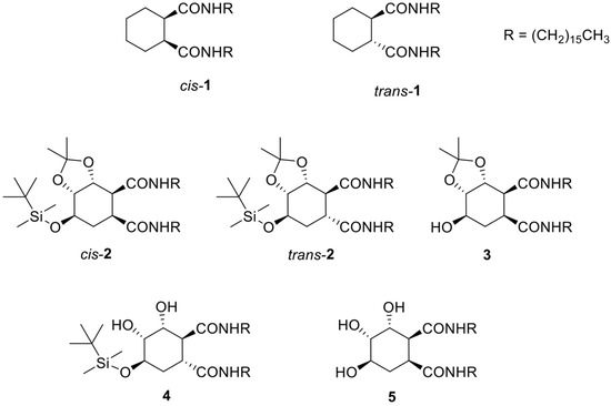 In this paper, we describe the investigation of five new polyhydroxylated cyclohexane bisamides (cis- and trans-2, 3–5, Figure 2), prepared from (−)-shikimic acid. All of them bear two long alkyl chains and three hydroxyl groups with different degrees of protection. These new polyfunctional LMWOGs have been compared with their parent compounds cis- and trans-1 focusing the attention on the influence of the polar functional groups at the ring, especially the free hydroxyl groups, on their gelling power and aggregation mode in different solvents. With this purpose, the complementary results obtained from several experimental techniques (use of Hansen parameters, SEM and CD spectroscopy) as well as from computational calculations have been taken into account to understand and rationalize the main interactions involved in each case.