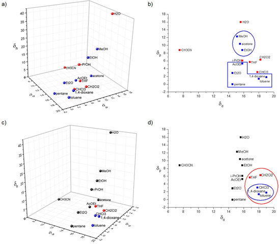 (a,c) HSPs representation and (b,d) 2D representation of δp vs. δd for the gelation study of compounds 4 (a,b) and 5 (c,d). Red: Solvents in which 4 or 5 are soluble; blue: solvents gelled.