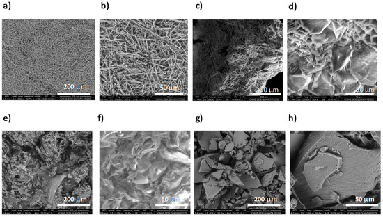 SEM images of xerogels at the mgc of: (a,b) cis-2 from methanol; (c,d) trans-2 from methanol; (e,f) 4 from acetone; (g,h) 4 from pentane, at two magnifications each (200 and 50 μm).