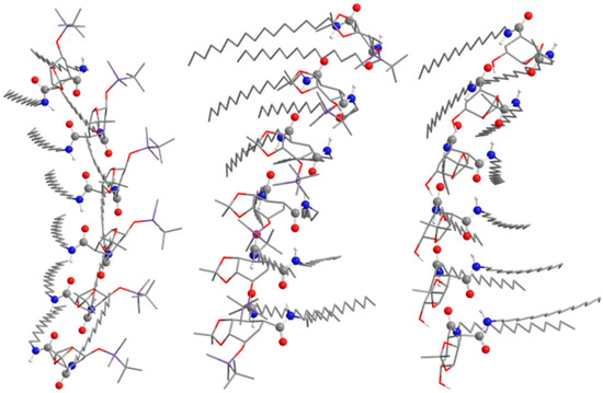 Predicted structures of the octamers from compounds cis- and trans-2, and 3 are shown in Figure 5. As it can be observed, due to the presence of the TBDMS group and the relative cis configuration of the two amide groups, compound cis-2 shows a significantly curved vertical aggregate. Otherwise, compounds trans-2 and 3 form a right-handed helical aggregate where the chains are placed in such a way that maximizes the Van der Waals interactions.