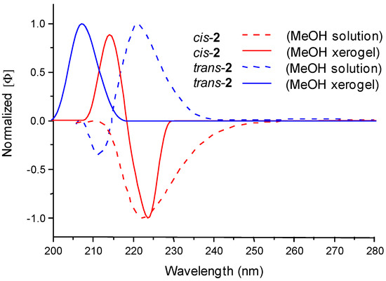 In solution, cis- and trans-2 show a band in the CD spectrum. cis-2 Presents a negative band with a maximum at 222 nm and trans-2 shows a positive band with a maximum at 221 nm and a small negative lobule at 211 nm. The CD spectra of these organogelators in methanol solution were also computed giving predictions in very good agreement with the experimental spectra (see Figure S1 in Supplementary Materials).