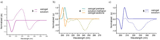 (a) Normalized CD spectra of methanol solution (2.47 mM) and xerogel at the mgc from toluene in KBr (20 mM) of 3 at 25 °C; (b) Normalized CD spectra of methanol solution (2.56 mM) and xerogels at the mgc in acetone and pentane, respectively, in KBr (20 mM) of 4 at 25 °C; (c) Normalized CD spectra of 5 in methanol solution (2.17 mM) and xerogel at the mgc from toluene in KBr (20 mM) at 25 °C.