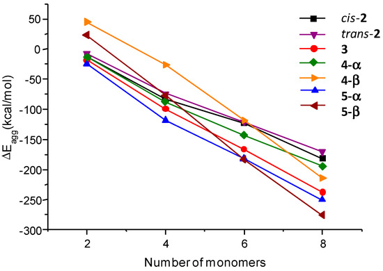 These structural features were also supported by the aggregation energy of the formation of the dimeric to the octameric aggregates, which was calculated for compounds 2–5 (ΔEagg). The aggregation energy per molecule (ΔEagg/n) was also considered (see Figure S2). Figure 9 shows the computed values and suggests that the aggregation of all compounds is favorable because the aggregation energy becomes more negative as the number of monomers increases.