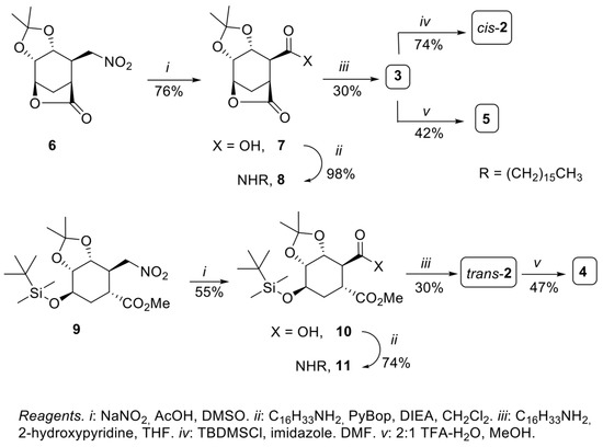The synthesis of polysubstituted 1,2-cyclohexanedicarboxamides 2–5 was achieved from polysubstituted lactone 6 and 2-nitromethylcyclohexanecarboxylic acid methyl ester (9). respectively, previously obtained from commercially available (−)-shikimic acid (Scheme 1) [31].