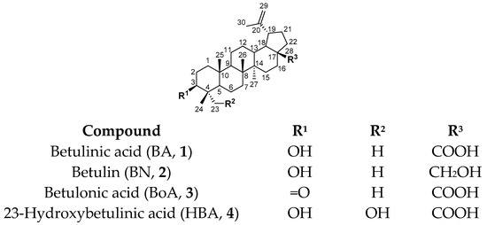Structures and numbering system of betulinic acid (BA, 1), betulin (BN, 2), betulonic acid (BoA, 3), and 23-hydroxybetulinic acid (HBA, 4).