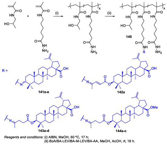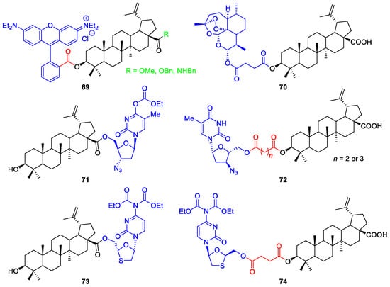 Other interesting examples involving esterification reactions are the synthesis of esters of rhodamine B with triterpenoids 69 [44], an artesunic acid–BA hybrid 70 [40], and ester-linked conjugates of BA with anti-HIV drugs [azidothymidine (AZT) and lamivudina (3TC)] 71–74 [43] (Figure 3).