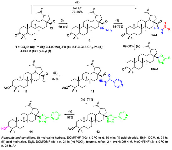 Antimonova et al. reported the synthesis of BoA and BA derivatives containing a 1,3,4-oxadiazole moiety at C-17 and studied their cytotoxic activity in three different human tumor cell models (CEM-13, MT-4, and U-937), revealing that BoA hydrazide intermediate 9d (CCID50 = 12 µM) and 1,3,4-oxadiazole derivative 10f (CCID50 = 15.4 µM) were the most active compounds, being slightly more active than the pristine BoA 3 (CCID50 = 19 µM) against U-937 tumor cells [16]. The employed methodology to prepare the referred compounds consisted in the reaction of acid chlorides (BoA chloride 7 and 3-β-O-acetyl-BA chloride 11 previously synthesized) with acid hydrazides and subsequent cyclization of the resulting acylhydrazides 9a–f and 12, affording the 1,3,4-oxadiazole derivatives 10a–f, 13, and 14 (Scheme 2).