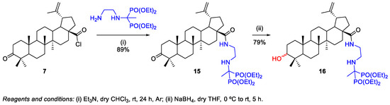 Becker et al. prepared aminobisphosphonate‒BoA 15 and aminobisphosphonate‒BA 16 conjugates, using the methodology described above, in order to obtain potential anticancer agents [23]. Conjugate 15 was synthesized in 89% yield through the reaction of BoA chloride 7 with tetraethyl 1-(2-aminoethylamino)ethane-1,1-diyldiphosphonate in the presence of Et3N (Scheme 3). Then, the reduction of compound 15 with NaBH4 in tetrahydrofuran (THF) gave bisphosphonate derivative of BA 16 in excellent yield (79%).
