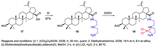 Emmerich et al. published the synthesis of a series of BA‒cisplatin complexes (Scheme 4 and Scheme 11), which were assessed for their cytotoxicity and selectivity against five different tumor cell lines (A549, A2780, 8505C, 518A2 and MCF-7), revealing that the synthesized conjugates 19 (IC50 = 11.57–17.32 µM) and 64 (IC50 = 13.13–29.83 µM) showed similar cytotoxicity to the pristine BA 1 (IC50 = 8.75–14.8 µM) and in all the cases, these complexes were found to be less cytotoxic than cisplatin (IC50 = 0.33–1.34 µM) against all the used tumor cells [17]. The synthetic methodology used to obtain the BA‒cisplatin complexes started with the preparation of the alkyl amide 18 by the reaction of the acid chloride of 3-O-acetyl-BA 17 with diethylenetriamine in dichloromethane (DCM) (Scheme 4). Then, this intermediate 18 was used as ligand in the complexation with dichlorobis(dimethylsulfoxide) platinum(II) in methanol (MeOH), followed by reaction of the appropriate dimethylsulfoxide (DMSO) platinum complexes with an aqueous LiCl solution, affording the BA‒cisplatin conjugate 19.