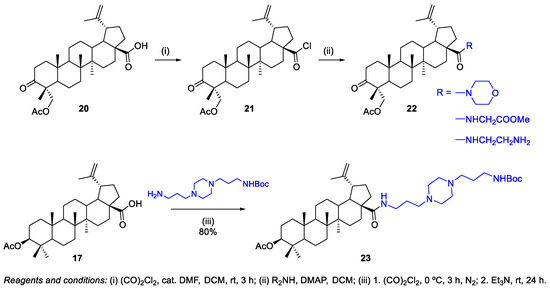 Simpler amide derivatives were prepared through the referred methodology, starting from 23-O-acetyl-3-oxo-HBA 20 [18] and 3-O-acetyl-BA 17 [15,19] (Scheme 5).