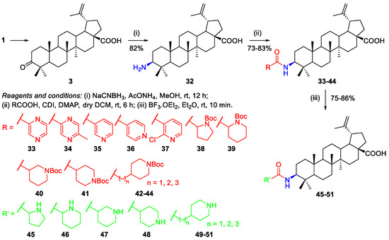 A different methodology was employed to prepare BA-based amide derivatives at C-3 [31]. The key intermediate 32, a BA-based primary amine, was obtained in very good yield (82%) by Borch reduction of BoA 3 with sodium cyanoborohydride and ammonium acetate in methanol (Scheme 8). Then, the authors found that N,N’-carbonyldiimidazole (CDI) was the optimal condensation agent and provided compounds 33–37 and intermediates 38–44 in good yields (73%–83%). Intermediates 38–44 were converted into compounds 45–51 by deprotection of the tert-butyloxycarbonyl (Boc) group in the presence of mild boron trifluoride etherate. Furthermore, the synthesized compounds were investigated for their activity against the growth of eight non-drug resistant and one multidrug-resistant tumor cell lines. Compound 48 was the most active one (IC50 = 0.33–2.45 µM), being on average 20-fold more potent than the parent BA 1 (IC50 = 14.04–38.50 µM).