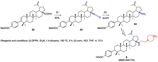 Regueiro-Ren et al. reported the synthesis and preclinical characterization of the potent and orally active BMS-955176 6, a second generation HIV-1 maturation inhibitor [8]. Its synthetic procedure involved a Suzuki coupling at C-3 starting from BA 1, which will be described in Scheme 24, and a Curtius rearrangement using diphenyl phosphoryl azide (DPPA) to afford the C-17 primary amine 54 (Scheme 9). This method could be carried out either in a single step or stepwise via isolation of the corresponding C-28 isocyanate 53.