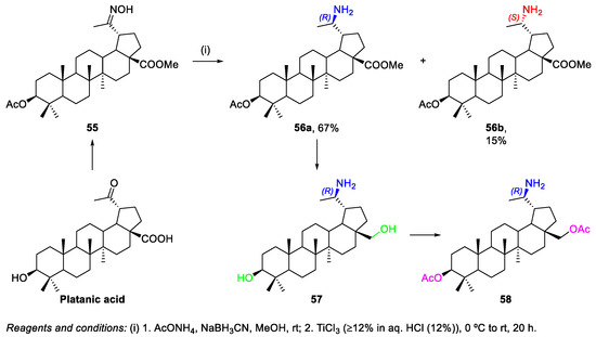 Kahnt et al. prepared the BN-derived amine 58, starting from platanic acid, which is the C(20)=O BA analogue [32]. The reduction of oxime 55 with NaBH3CN/TiCl3/NH4OAc in methanol gave the amines 56a,b in 67% and 15% yields, respectively (Scheme 10); these compounds were separated by chromatography, and their absolute configuration at C-20 was determined using 1H NMR spectroscopy. Then, BA-derived amine 56a was converted into BN-derived amine 58 in a two-step sequence. Furthermore, the synthesized 20-amino derivatives were screened for their cytotoxicity against five human cancer cell lines [32]. Derivative 58 was the most active compound (EC50 = 2.1–4.0 µM), being more potent than deprotected 20-amino-BN derivative 57 (EC50 = 16.0 to >30 µM) and even parents platanic acid (EC50 > 30 µM) and BA 1 (EC50 = 11.0–18.9 µM).
