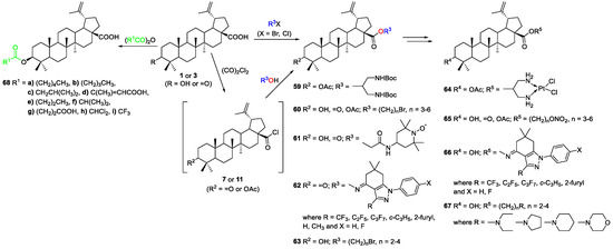 Positions 3 and 28 of BA skeleton are easily functionalized through esterification reactions and, consequently, many studies involving this transformation have been reported [17,22,27,31,34,35,36,37,38,39,40,41,42,43,44,45,46,47]. The used methodologies involve: (i) The reaction of 17-COOH group of BA 1 with alkyl halides in the presence of a base (mainly, K2CO3), or (ii) the reaction of BA-based acyl chloride intermediate with alcohols, or even (iii) the reaction of 3-OH group of BA 1 with acid anhydrides in the presence of a catalyst [usually, 4-(dimethylamino)pyridine (DMAP)] (Scheme 11). Some of these reports will be highlighted in the following examples.