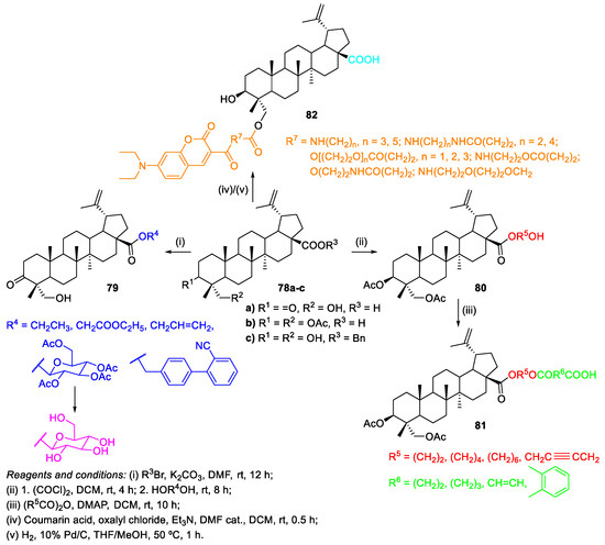 Another interesting report involving esterification reactions at 23-OH group of HBA 4 was published by Yao et al. [51]. The authors synthesized a series of fluorescent HBA derivatives conjugated with coumarin dyes 82 and evaluated them for their antiproliferative activity. The HBA probe bearing –NH(CH2)2NHCO(CH2)2– as substituent was the most antiproliferative compound (IC50 = 4.07 and 6.26 µM) against two tumor cell lines (B16F10 and MCF-7), having been further studied for live cell imaging in order to elucidate the mechanisms of anticancer action of HBA 4. The synthesis of the fluorescent HBA probes 82 consisted in the reaction of the HBA benzyl ester derivative 78c with the acyl chloride derivatives of coumarin dyes (which were prepared in situ using oxalyl chloride and DMF as catalyst) in the presence of Et3N, in dry DCM, followed by debenzylation with 10% Pd/C as catalyst under atmospheric pressure of hydrogen (Scheme 13). The desired compounds 82 were obtained in poor to fair yields (20%–60%).