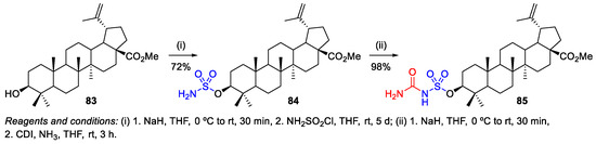 Sommerwerk et al. synthesized and evaluated the cytotoxic activity of several methyl esters of natural triterpenic acids, including BA 1 [52]. Sulfamate 84 was evaluated for its cytotoxic activity against six human tumor cell lines (518A2, FaDu, HT-29, MCF-7, A549, and SW1736). Although this sulfamate has demonstrated high cytotoxic activity (EC50 = 6.7–10.1 µM), it was less active than the corresponding C(3)-sulfamate of methyl maslinoate (EC50 = 2.9–4.0 µM). The employed methodology consisted in the conversion of methyl betulinate 83 into its corresponding sulfamate 84 by deprotonation of the 3-hydroxyl group followed by the addition of freshly prepared sulfamoyl chloride (Scheme 14). Then, the sulfamate 84 was treated with sodium hydride, CDI, and ammonia, in THF, leading to the formation of the corresponding carbamoylsulfamate 85 in excellent yield.