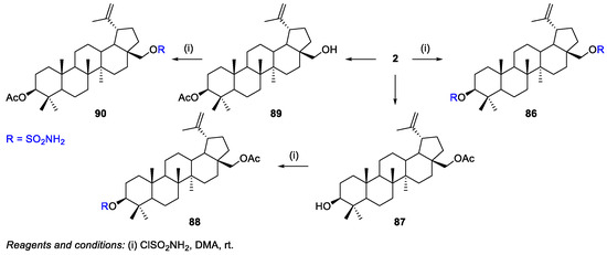 A series of betulinyl sulfamates 86, 88, and 90 have been synthesized and evaluated for their in vitro anticancer activity and carbonic anhydrase IX (CAIX) inhibition (an attractive target for tumor-selective therapy strategies in cancer cells) [53]. The positions 3 and 28 of BN were modified by the reaction of BN 2 with sulfamoyl chloride, affording a di-substituted BN-sulfamate derivative 86 and mono-substituted derivatives 88 and 90 (Scheme 15). The presence of different substitution patterns allow the establishment of structure-activity relationships [53]. Among the synthesized sulfamates, C(28)-mono-substituted derivative 90 (IC50 = 4.87–9.94 µM) was the most cytotoxic compound against five tumor cell lines (518A2, 8505C, A2780, MCF-7, and A549) and possessed high inhibitory activity towards CAIX (Ki = 1.25 nM).