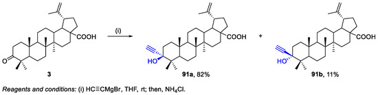 Govdi et al. prepared BA derivatives 91a,b bearing an alkyne group at C-3 via the reaction of ethynylmagnesium bromide with BoA 3 (Scheme 16) [54]. This reaction afforded the major diastereomer 91a with the axially oriented alkynyl group, in 82% yield, together with the minor isomer 91b, having the equatorially oriented ethynyl group (11% yield). These compounds were used as starting materials to synthesize new BA derivatives containing 1,2,3-triazole peptide fragments at C-3, as shown in Scheme 19.