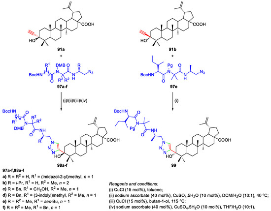 Govdi et al. reported the synthesis of new BA–peptide conjugates linked through a 1,2,3-triazole moiety using the CuAAC methodology (Scheme 19) [54]. These authors prepared the required BA derivatives bearing an alkyne group at C-3 91a,b (Scheme 16) and, then, these compounds reacted with azidopeptides 97a–f to give the desired conjugates 98a–f and 99 in 60%–88% and 73% yield, respectively. All obtained compounds were tested for their anti-inflammatory activity. In particular, BA–peptide conjugates 98a,b,d,e were found to exhibit high anti-inflammatory activity, comparable to that of indomethacin (a nonsteroidal anti-inflammatory drug), and the introduction of these amino acid residues in BA core enhanced its anti-inflammatory properties by 14.3%–32.4% [54].