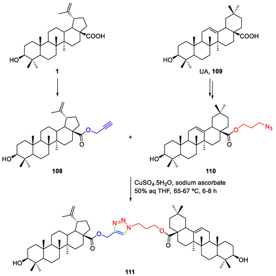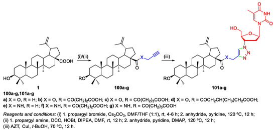 Thi et al. described a synthetic approach toward novel triazole-linked BA–AZT hybrids 101a–g (Scheme 20) [63,66]. Once again, the used methodology consisted on a Cu(I)-catalyzed 1,3-cycloaddition between propargyl-substituted BA derivatives 100a–g and AZT (an antiretroviral drug used in the treatment of HIV/AIDS). The synthesized BA–AZT hybrids 101a–g were studied for their anticancer activity and revealed moderate to good cytotoxicity against two human tumor cell lines (KB and Hep-G2). In addition, amide–triazole-linked hybrids seemed to be less potent than the corresponding ester–triazole-linked analogues. For instance, derivative 101a (IC50 = 5.9 and 7.0 µM) showed higher cytotoxicity than 101e (IC50 = 126.1 and 92.5 µM). The parent pharmacophores BA (IC50 = 27.5 and 23.9 µM) and AZT (IC50 > 479 µM) also showed considerably less potent cytotoxic activities as compared to the most promising BA–AZT conjugate 101a.